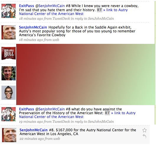 Activism Autry National Center of the American West Posted on March 2, 2009March 2, 2009 by The 40 year old magpie in Activism Why does @SenJohnMcCain hate you? You teach and keep the stories, histories of the American West, good and ill. here, then are the tweets of @SenJohnMcCain for ever immortalized on the intertubes and here (read from bottom to top.) Share this: Click to share on X (Opens in new window) X Click to share on Reddit (Opens in new window) Reddit Click to print (Opens in new window) Print Click to email a link to a friend (Opens in new window) Email Click to share on Tumblr (Opens in new window) Tumblr Click to share on Facebook (Opens in new window) Facebook Click to share on Pinterest (Opens in new window) Pinterest Click to share on LinkedIn (Opens in new window) LinkedIn Like Loading... Related